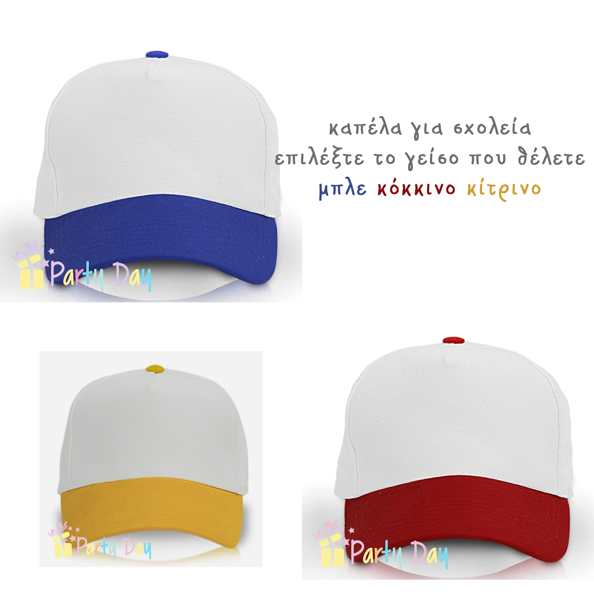 Oικονομικά καπέλα για σχολεία, κατάλληλα για τις διαδρομές των παιδιών, για να ξεχωρίζουν οι τάξεις και τα σχολεία. Αναμνηστικά καπέλα για τις λήξη της σχολικής χρονιάς.Καπέλα για erasmus, και σχολικές εκδηλώσεις. Καπέλο Λευκό με Γείσο Χρωματιστό Για Σχολεία. Oικονομικά καπέλα για Έναρξη - λήξη σχολικής χρονιάς.διαφημιστικά καπέλα με εκτύπωση.Δώρα για το τέλος της σχολικής χρονιάς. Αποφοίτηση – Λήξη σχολικού έτους. Καλοκαιρινή γιορτή λήξης σχολικής χρονιάς. Oικονομικά καπέλα για κατασκήνωση. Λήξη σχολικής χρονιάς στο Δημοτικό Σχολείο Γυμνάσιο Λυκειό και το Νηπιαγωγείο για κατασκήνωση. Γιορτή λήξης του σχολικού έτους. Kαπελα ληξης σχολικης χρονιαςΚατάλληλο για παιδιά δημοτικού Γυμνασίου και ενηλίκων Περίμετρος 58 cm