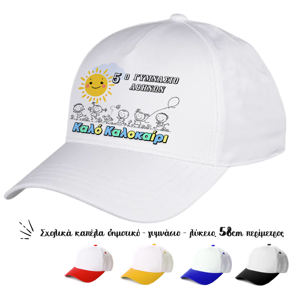 Oικονομικά καπέλα για σχολεία, κατάλληλα για τις διαδρομές των παιδιών, για να ξεχωρίζουν οι τάξεις και τα σχολεία. Αναμνηστικά καπέλα για τις λήξη της σχολικής χρονιάς.Καπέλα για erasmus, και σχολικές εκδηλώσεις. Καπέλο Λευκό με Γείσο Χρωματιστό Για Σχολεία. Oικονομικά καπέλα για Έναρξη - λήξη σχολικής χρονιάς.διαφημιστικά καπέλα με εκτύπωση.Δώρα για το τέλος της σχολικής χρονιάς. Αποφοίτηση – Λήξη σχολικού έτους. Καλοκαιρινή γιορτή λήξης σχολικής χρονιάς. Oικονομικά καπέλα για κατασκήνωση. Λήξη σχολικής χρονιάς στο Δημοτικό Σχολείο Γυμνάσιο Λυκειό και το Νηπιαγωγείο για κατασκήνωση. Γιορτή λήξης του σχολικού έτους. Kαπελα ληξης σχολικης χρονιαςΚατάλληλο για παιδιά δημοτικού Γυμνασίου και ενηλίκων Περίμετρος 58 cm